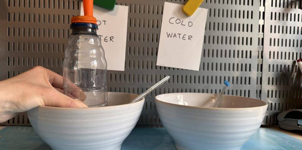 Experiment with different water temperatures and record how long it takes for the balloon to inflate at each temperature. For this to be a fair test, you’ll need to make sure the air inside the bottle is at room temperature before placing it in each bowl of water.