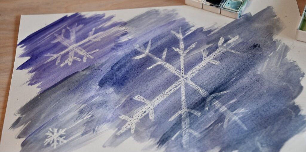 Using the watercolour paint, gently paint over the crayon snowflakes. They should become visible as they are painted over.