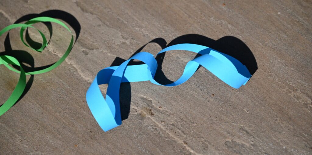 A Möbius strip is a loop with one side and one edge. It’s made by twisting a strip of paper 180 degrees and taping the ends together. There’s no obvious difference between inside and outside. If you draw a line around the centre of the paper, it’ll cross over to the other side, and you’ll end up back where you started.